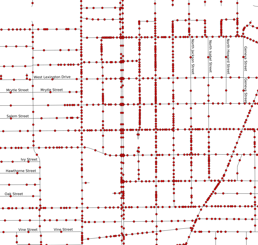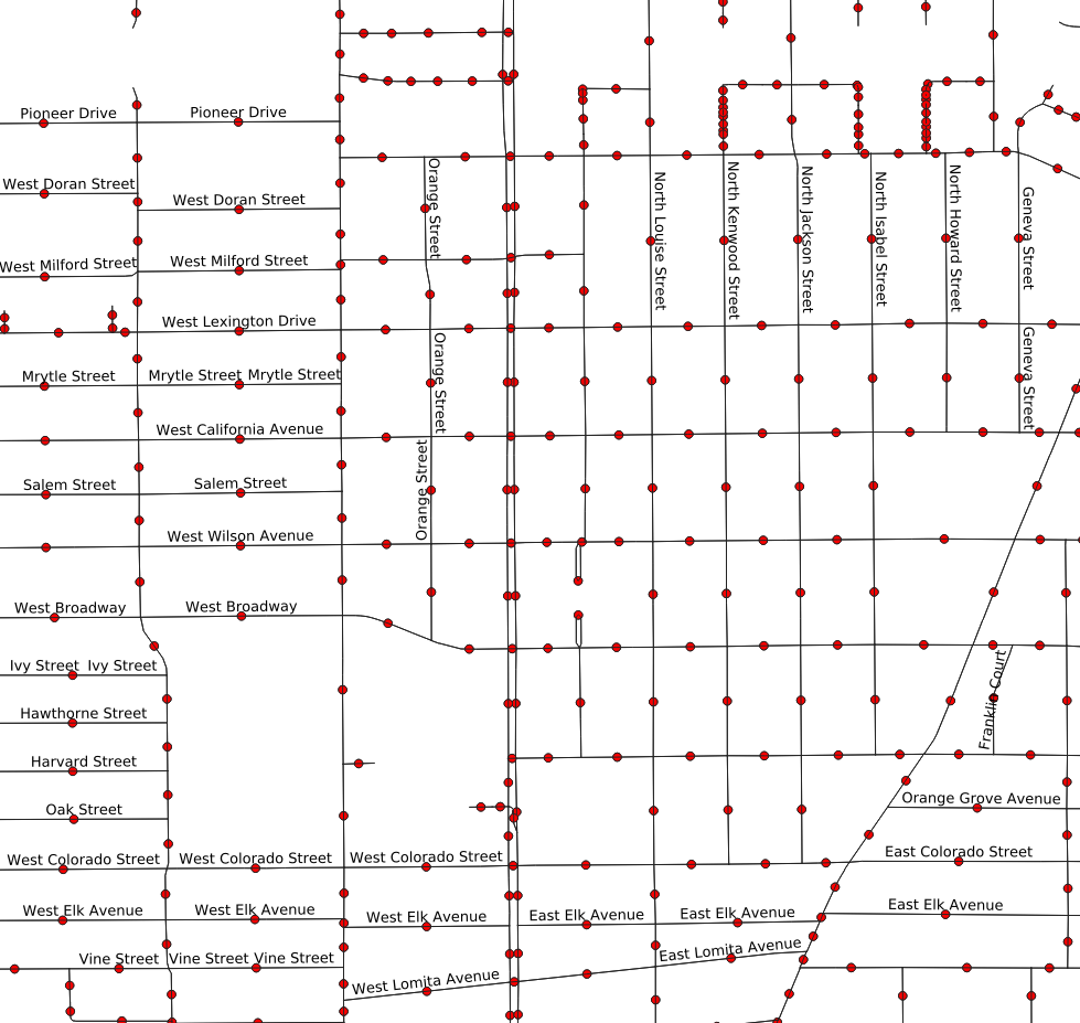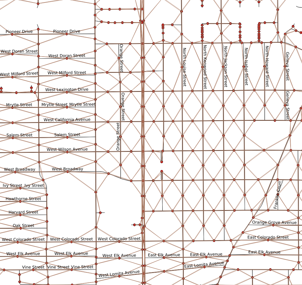 There is a hidden problem with the that street map. While it looks like a nice neat series of connected road segments, it is actually a huge messy pile of way too many segments. OSM data is designed for many purposes, not just for routing. The source data isn’t necessarily as clean as it can be for routing or edge covering problems. The problem with the City of Glendale data is that many of the roadway segments between intersections are broken up into multiple sub-segments. The figure to the right illustrates this by placing a dot in the middle of each link. Instead of one dot between each intersection, for most streets there are many of these dots. When the graph is transformed into a line graph, each of these sub-segments will become a required node visit—4, 6, or even 10 nodes to consider visiting, instead of just one. This greatly expands the size of the problem the solver will need to solve.