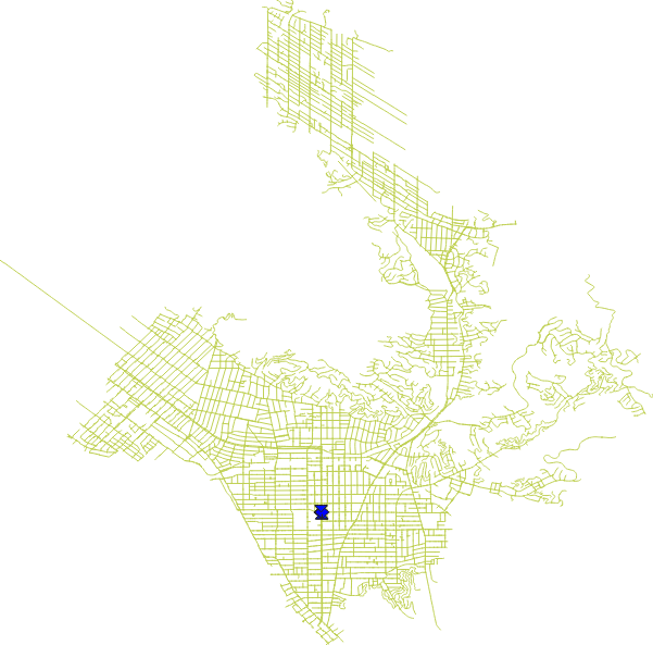 This reduced the Southern California OSM file to just those ways that are contained in or overlap the city of Glendale. After trimming some features I’m uninterested in (all polygons, freeways and service roads, etc), the resulting network table has 7,674 entries. Some of these links are not part of the city, and others form isolated leaf nodes or links that were ignored. The street map, as rendered by QGIS, is shown in the map to the right. There are some extra segments, as the cutting-out process includes “ways”, not just the individual segments. So the really long way that extends all by itself off to the northwest will be truncated in a real project.