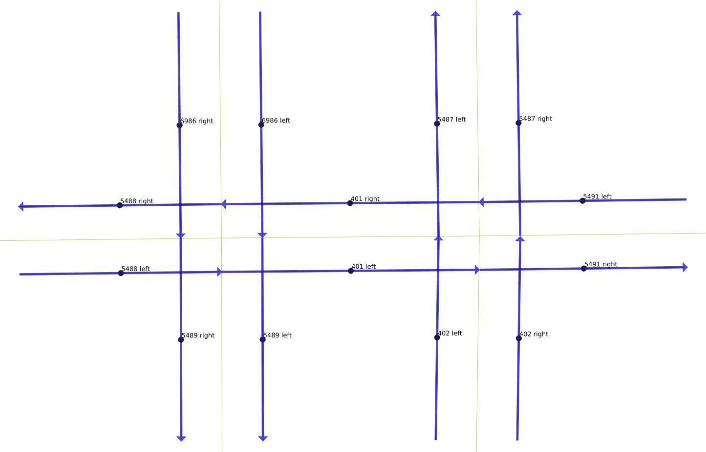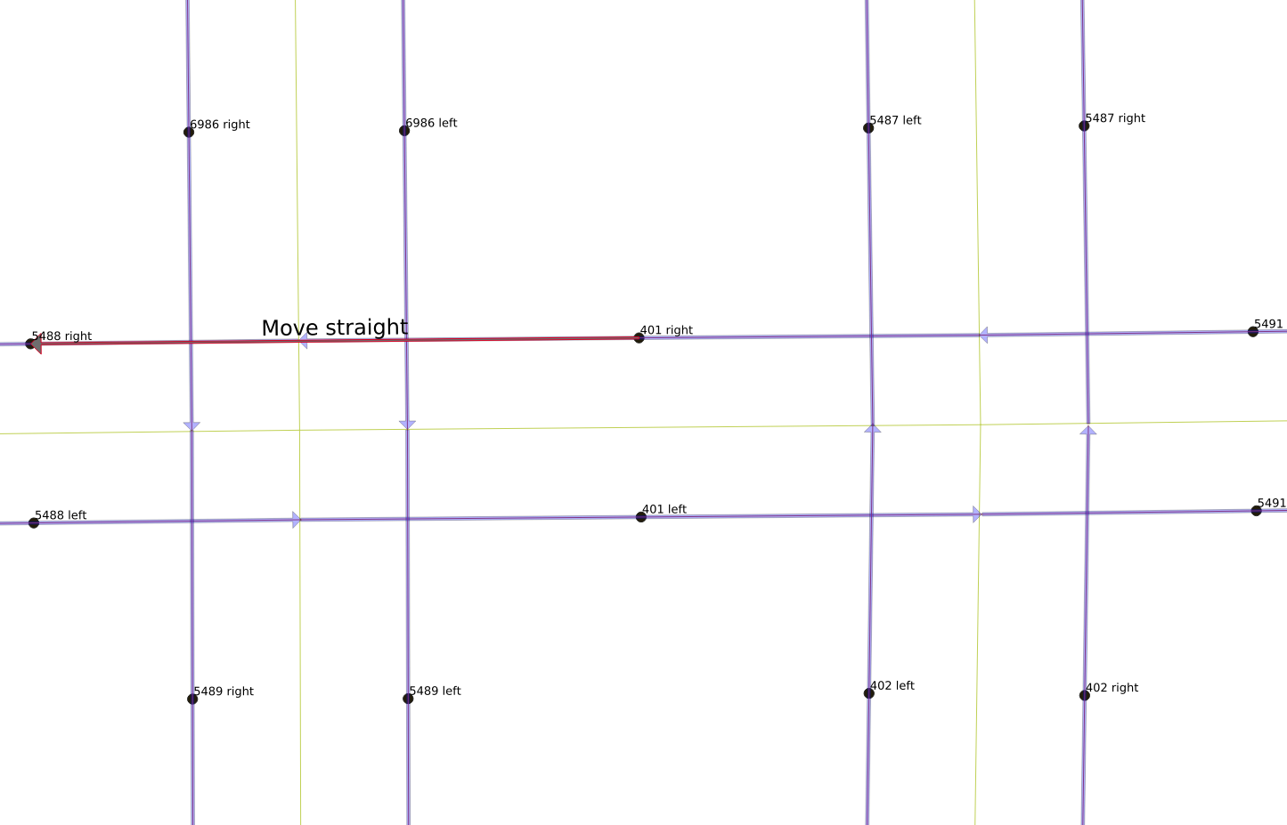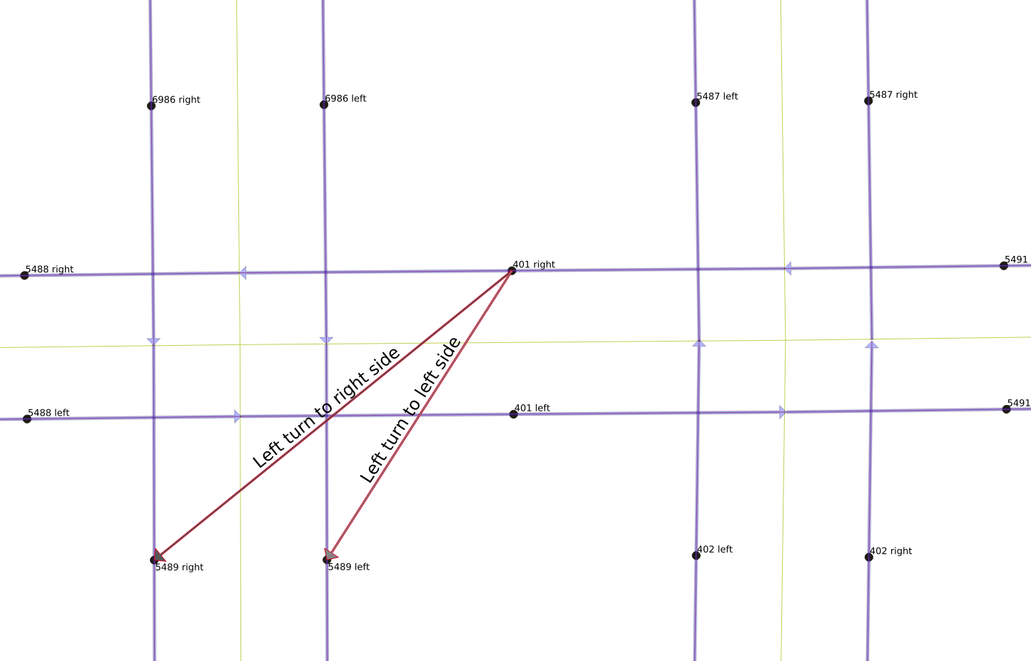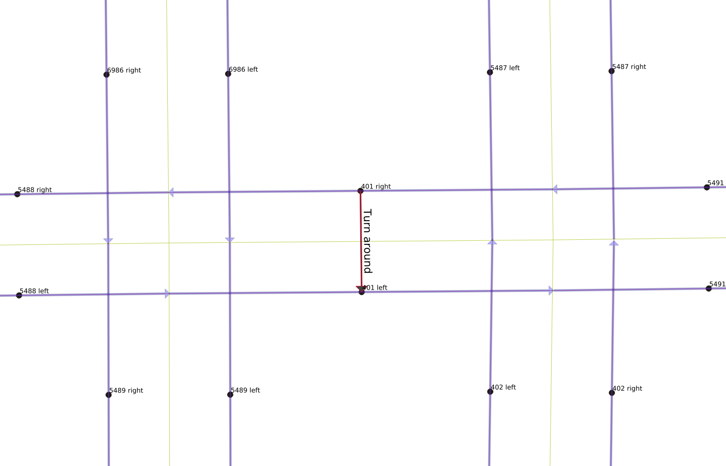 There are legal and illegal movements from each link. The next three figures show the legal movements off of link “401 right”. A vehicle on that link can either keep moving straight, as shown to the right, or it can turn left onto either side of the one-way north-south link 5489, or it can make a U-turn and move back the way it came on link “401 left”, as shown in the below-right figure. However, it is not legal for it to make a right turn, however, and it also cannot move backwards to any of the other links.